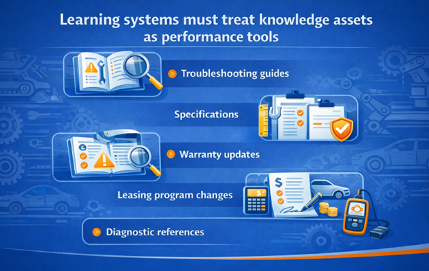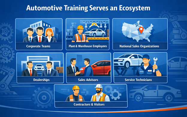 Automotive learning must support distributed dealer networks, multiple languages, compliance mandates, and rapidly evolving technical requirements such as EV systems.