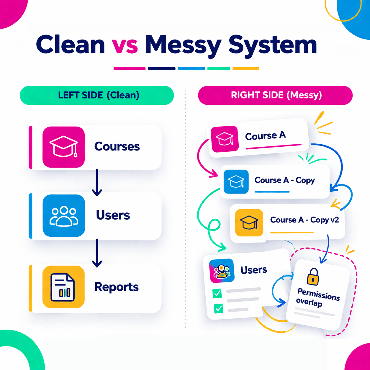 Usually, the system does not fail all at once. Instead, it becomes harder and harder to manage. Content gets duplicated. Permissions become more difficult to maintain. Reporting becomes fragmented. The central team spends more time handling exceptions and less time improving the learning experience. Over time, the administrative burden grows, and the learner experience becomes less consistent.