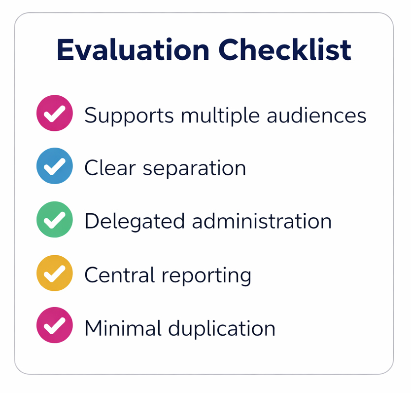 Can it support multiple audiences without forcing duplication? Can teams manage their own areas without creating risk? Can you maintain visibility across all programs without stitching together reports manually?